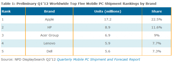 Apple continua a dominare il mercato dei PC portatili grazie al successo dell'iPad. Questo il responso dell'analisi sul primo trimestre 2012 condotta da NPD DisplaySearch, che va controtendenza con il metodo di normalizzazione dei dati e calcola le vendite dei tablet multimediali assimilate a quelle dei computer portatili e dei netbook.