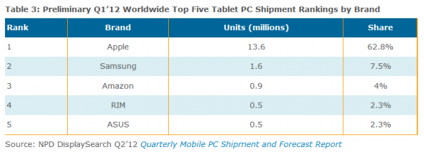 Anche dando per buona la seconda ipotesi, comunque resta il fatto che nessuno riesce a contrastare il fenomeno iPad. Lasciando da parte il settore Pc e guardando solo al comparto tablet, infatti, Apple resta saldamente al comando con oltre la metà del mercato globale (62,8 per cento) seguita a grande distanza da Samsung, che si è ripresa la seconda posizione con un market share del 7,5 per cento dopo il capitombolo del Kindle Fire.